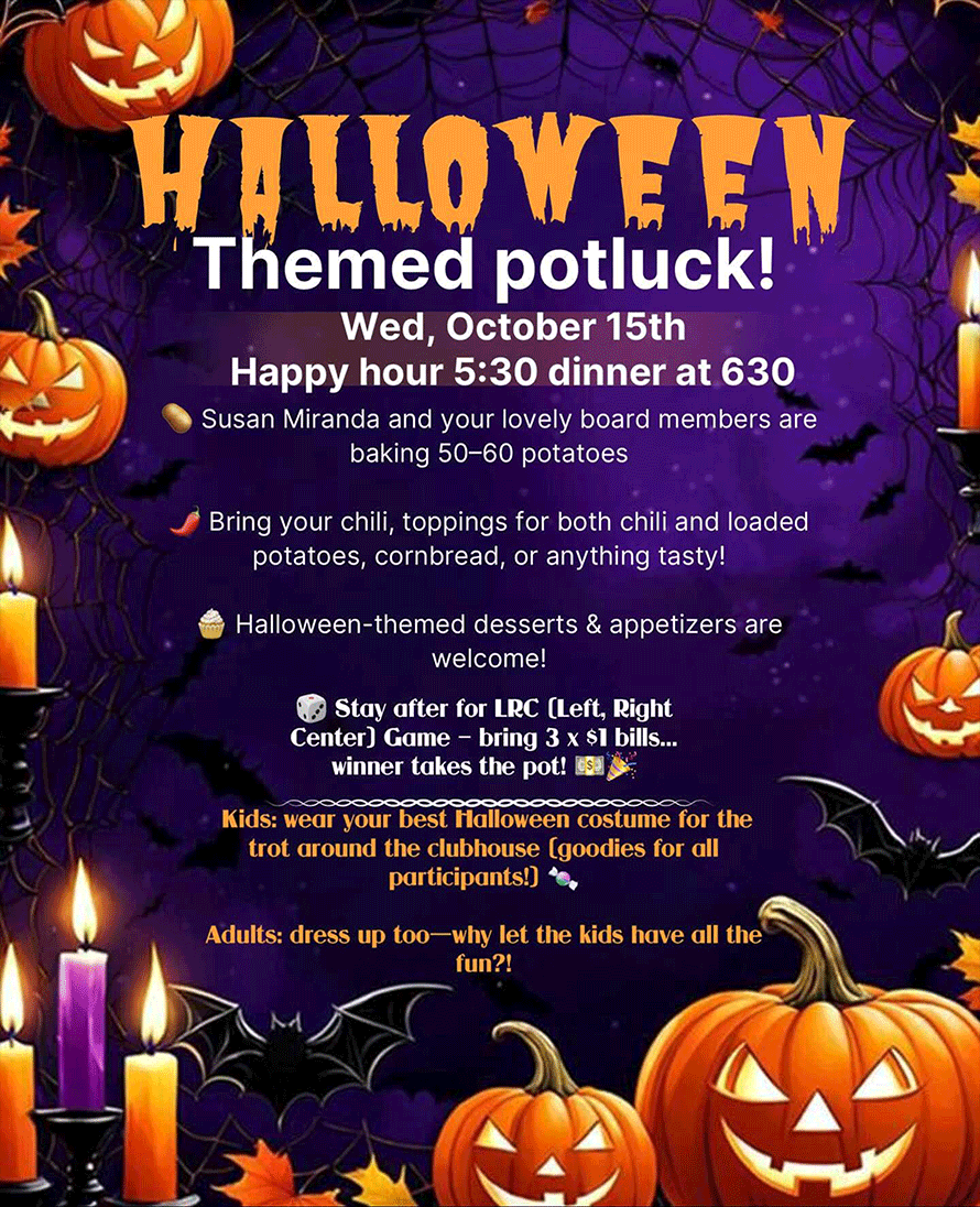 🎃👻 October 15, 2025 @ 6:30 pm 🎃👻 Let’s kick off fall and the spookiest month of the year with a cozy chili & potato bar plus a costume trot!